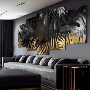 Black and Gold Leaves Painting Wall Decor for Living Room Nature Canvas Art Modern Artwork Framed Prints for Home Bedroom Picture Poster 5 Pieces Ready to Hang (12″x20″x2pcs+12″x28″x2pcs+12″x32″) Posters & Prints